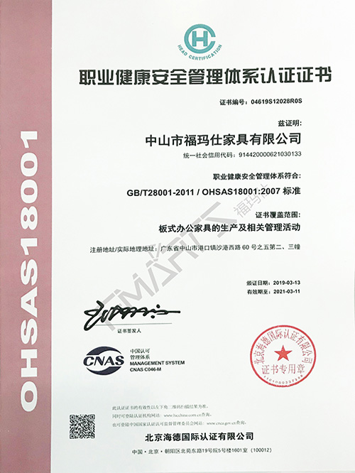 福瑪仕18001職業(yè)健康安全管理體系認(rèn)證證書